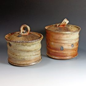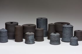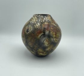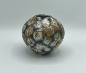 Gaby throws her pots at the wheel. For many years, she has focused on ‘Alternative Firing’ techniques, specifically Naked Raku and Saggar Firing. The surface of her pots is unglazed, and the surface decoration is created using smoke and a variety of metals. Her surfaces are burnished until they are pebble-smooth and tactile.