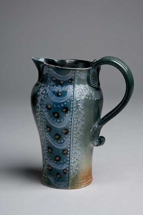 She uses 4 different techniques: throwing, slab-building, extruding and slip-casting then vapour-glazes with both salt and soda at 1300c, and fumes with stannous chloride to create random areas of lustrous iridescence.