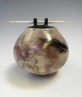 I use a variety of “naked raku” firing techniques for my work. Saggarfirings with salt, copper and sawdust give subtle hues of colour to the burnished surfaces of the vessels. I also work with black and white horsehair and feather-carbonization and often combine different techniques through multiple firings. Recent work shows the results of experiments with ferric chloride and foil saggars.