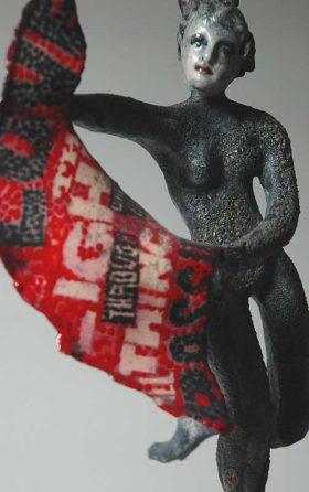 The figures have elements of adornment and stillness in their doll-like postures They are placed in a context in which to perform, a framework of platforms, plinths, ledges and spheres, which give me surfaces to build on using silk-screening, press molding, transfer prints and glazes.