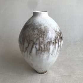 Complex surfaces develop from firing the pieces with wood - flame and ash painting the work. He uses his own blend of high temperature firing clays which are chosen to promote flashing and glaze effects in the kiln.