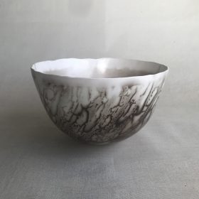 The work explores the way that girls are constrained from birth to conform to an appearance and code of behaviour, to present a perfect face, and maintain the expectations of others. The use of porcelain, or of stoneware with layered disrupted surfaces, describe the vulnerability beneath. The functional items that Carl makes appear to be simple yet much consideration is given to the form of each piece.