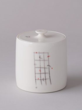 All of my work is wheel-thrown and hand decorated. I use Earthstone Ming porcelain which I bisque to cone 06 and glaze fire to cone 10 in an electric kiln. My vases and pear pots are thrown in one piece, including the necks or ‘stalks’. The lids of the straight sided jars are also thrown in one piece and the ‘stalks’ of the lidded pear pots are attached, thrown and altered after the lids have been trimmed. I refine the surfaces with a sharp blade to achieve a smoothness that later allows me to draw on the patterns.