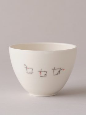 After the bisque firing, I decorate most of my pieces with a ceramic pencil and red underglaze. I work with a glossy transparent glaze and am currently developing a dusky blue glaze, similar to a Korean Celadon, to be fired in an electric kiln.