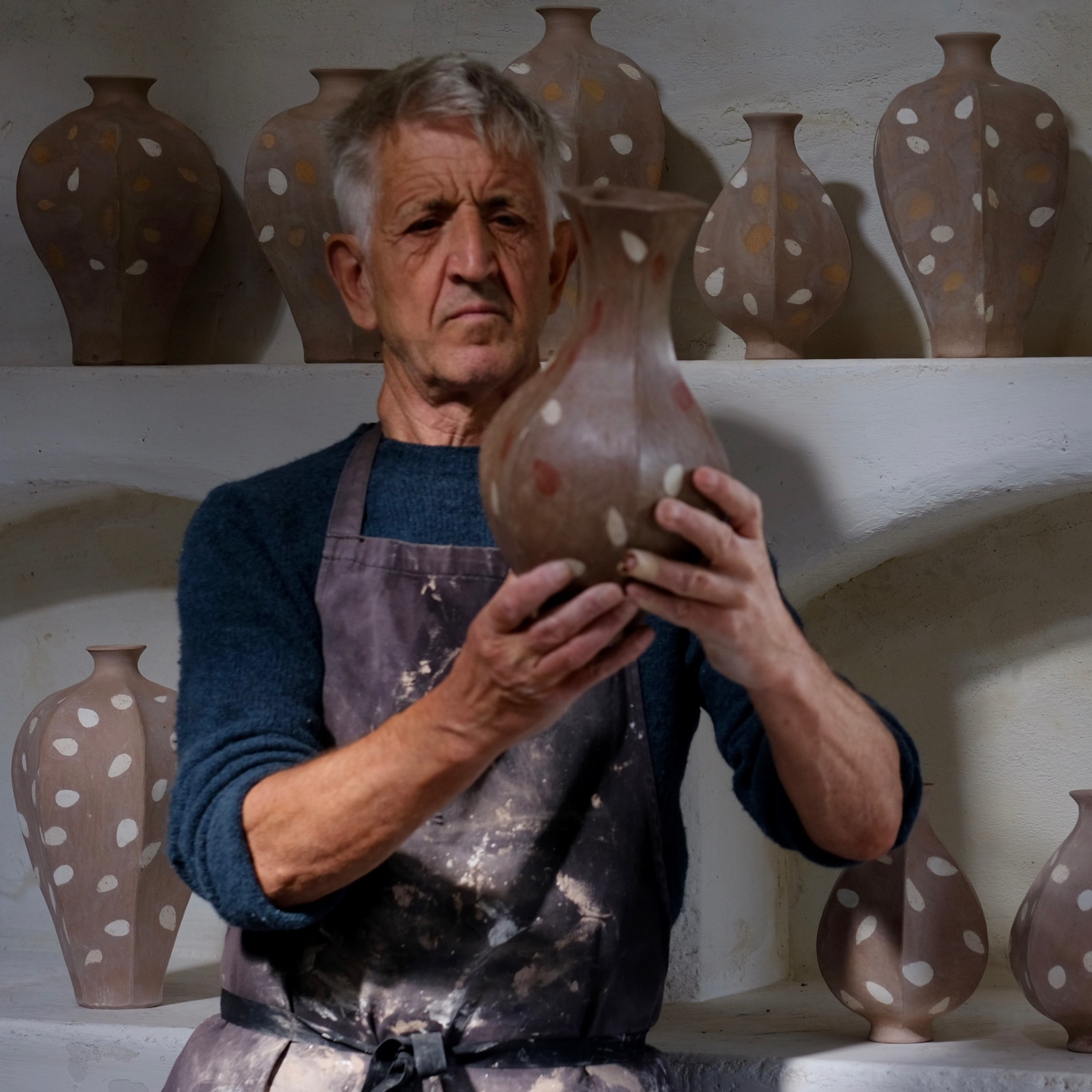 Smitten with pottery visiting the studio of Scott Marshall in Cornwall as a teenager, I trained at Camberwell and in the studios of my tutors Colin Pearson and Janice Tchalenko. I was drawn to the warmth of terra cotta, and early experiments with domestic slipware evolved into a life-long search for harmony between surface and form.
