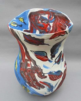 I use red earthenware and porcelain. I mix my own slips to achieve a varied palette of colours and tones. I savour the last energetic touch of drawing and scratching through the layers of slip to reveal the clay underneath (graffiti) This is very satisfying and enhances and completes the painted image. The effect of the graffiti, which can be exercised so liberally in ceramics, gives me immense, almost physical pleasure. It serves as a visual storage of energy.