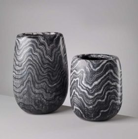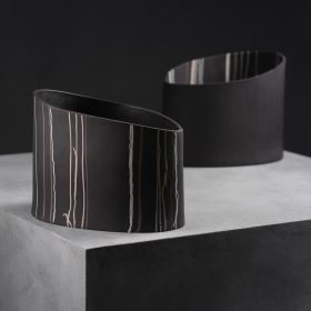 The unique effect of raku firing gives the pieces a distinctive crackle and smoky textures with a seemingly timeless quality. In contrast, wood, slate and precious metals add balance and harmony to the ceramics, accentuating the interplay