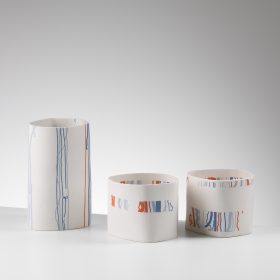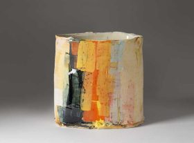 "Through my work I explore the playful relationship between form and surface decoration. The vessel is my primary interest, created by building and collaging slabs of textured clay together. Drawing inspiration from my 2D paper collages and sketches I translate this process into clay, building up layer upon layer of slips and glazes. Fluid brushstrokes intercept scratchy monoprint scrawls, set against bold blocks of colour, to give surfaces rich in texture and depth.The finished vessels have a graphic quality to them, with bold colour, strong line and intuitive mark making."