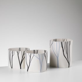 Inspired by people and places, and in response to specific themes or topics, Carol creates limited edition collections in black and white porcelain. Her work is carefully crafted while also having layers of meaning to draw attention to issues that she cares about. Living in a rural location, trees have become an important motif in Carol’s work, using them to draw attention to the environment. She has also adopted a “closed loop” approach to her practice where she repurposes and recycles as much material as possible from her ceramic production.