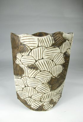 The highly textured work is hand formed, textured by beating, stretching or carving. Colours are achieved mostly by the firing processes. Some of the work is raku fired with post firing reduction. Other work is wood fired at stoneware for up to 24 hours with light reduction, or saggar-fired in the wood kiln with charcoal.