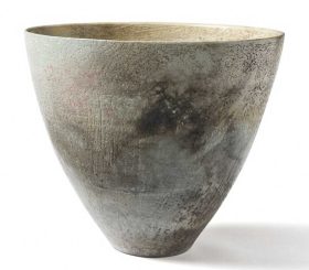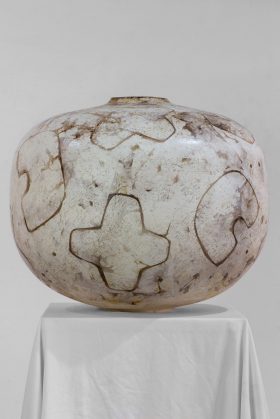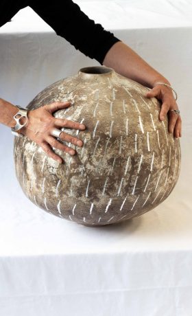 Moyra Stewart hand builds large sculptural vessels at her studio outside Auchtermuchty in Scotland. They are fired in a small outdoor kiln in the Naked Raku method.
