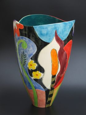 sculptural pieces ranging in scale from a few centimetres to over two metres, I have created installations and undertaken public art commissions. I frequently return to making vessels, drawn by the interplay between outer and inner and the lip where they meet. Inspired by mark making and painting, I take a relaxed and direct approach to making vessels. I aim to create a sense of drama that is fresh and exciting, exploring vibrant colour compositions and exploiting the gestural qualities of fluid brush marks and soft clay.
