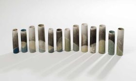 Her collection of boxes, jugs, vessels and bound containers are conceived as small scale installations or ceramic landscapes. Pots are carefully positioned to highlight the relationship between their interiors and exteriors.