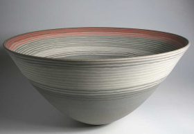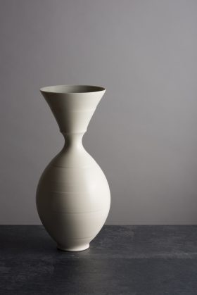 My vases and bowls are wheel-thrown exclusively in porcelain. I appreciate the repetitive nature of wheel throwing but concentrate on one-off pieces only. I search for shapes I find beautiful, making incremental modifications and additions, teasing out new discoveries. My pots have changed very gradually over time; similar themes recur alongside innovations as I search for the perfect shape and surface.