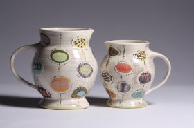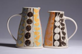 Valerie studied fashion and textiles at Brighton and Bristol art colleges; a background that is reflected in her use of bright colour. Ken learnt to pot with potters in Bristol and London and has had a long association with the country’s most prominent potters through his work as a consultant to the craft ceramic supplies industry. His early gallery experience selling work by many of the best potters including Rie, Coper and Leach has informed his approach to shape.
