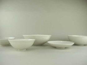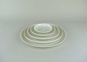 Ken and Valerie Shelton make individual bowls, vase and plates at their home in south Cheshire; Ken throws the pots on the wheel in fine white earthenware. When the pots have dried to a “leather hard” stage they are turned, and burnished to produce a completely smooth surface. The pots are then biscuit fired in the kiln to 1140°C.