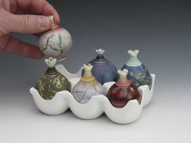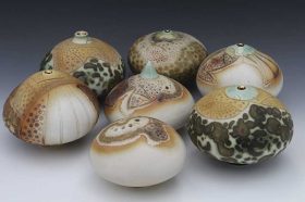 Using the wheel as a starting point the work is textured and refined by hand before firing at a low temperature in a smoke-filled kiln. Some people say my ceramics are like washed up sea creatures, some still alive, some just remnants turning slowly to dust. Others see unidentified objects from a far away galaxy, not sure whether they are organic or constructed, friendly or malevolent. They want to touch them and take them home in their pockets like a newly found treasure.