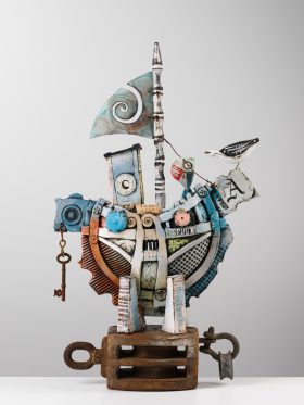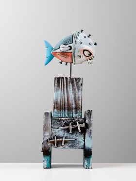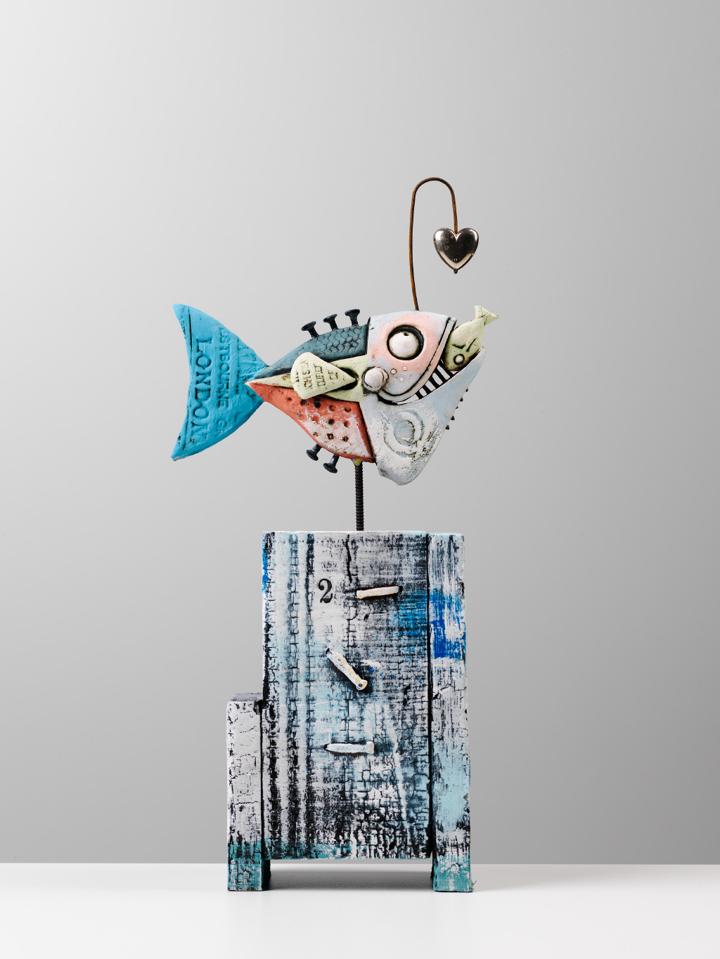 I try to put emphasis on the story-telling aspect of my work, crossing between reality and fantasy. I'm also quite a natural hoarder of things and my recycle/upcycle element extends from that. I find old relics and unusual design being part to blame. I try to re-invent objects and give them a new lease of life, rather than go to land fill. I think the importance of doing that is getting more and more relevant in today's environmental uncertainty. My clay element also mimics the aging process, from my ice cream colours to the rust and decay that partners weather-worn timber, metals, plastics, beach finds and ceramics.