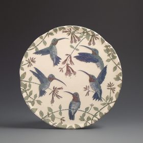 My stoneware pieces are inlaid with pattern and text, so that the decoration is part of the surface rather than a superficial addition. The body is sometimes stained first, and I use a matte glaze. Since being a small girl I have spent many happy hours drawing and painting images of nature which excited me. Discovering and specializing in the beautiful technique of Sgraffito has allowed me to combine my two loves of drawing and clay work. I am passionate about this time consuming process and have developed a distinctive and unique style, with each piece being made, and meticulously decorated by hand. Telling a story and trying to capture a fleeting moment in time I find very fascinating. My forms are thrown using a white fine stoneware and decorated using coloured slips, drawing, carving and sgraffito. Each piece is fired in an electric kiln with only the main themes of the decoration being glazed creating a tension between the matt and shiny surface. Many past ideas seem to have intertwined into my work and together portray a new sense of freedom. This freedom has inspired a new energy and the effect is spiralling.