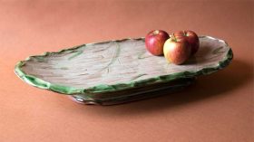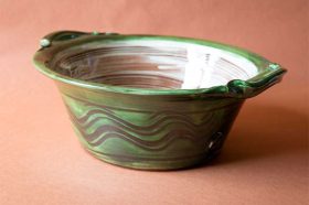 I make slip-decorated earthenware, fired to 1140 degrees centigrade. I use a red clay body with white or coloured slips and glazes.
