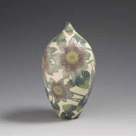 Carol’s inlay technique gives her the freedom to combine different patterns or glazes on the inside and outside of her vessels and she uses the interplay of surfaces to add depth and meaning to each piece.